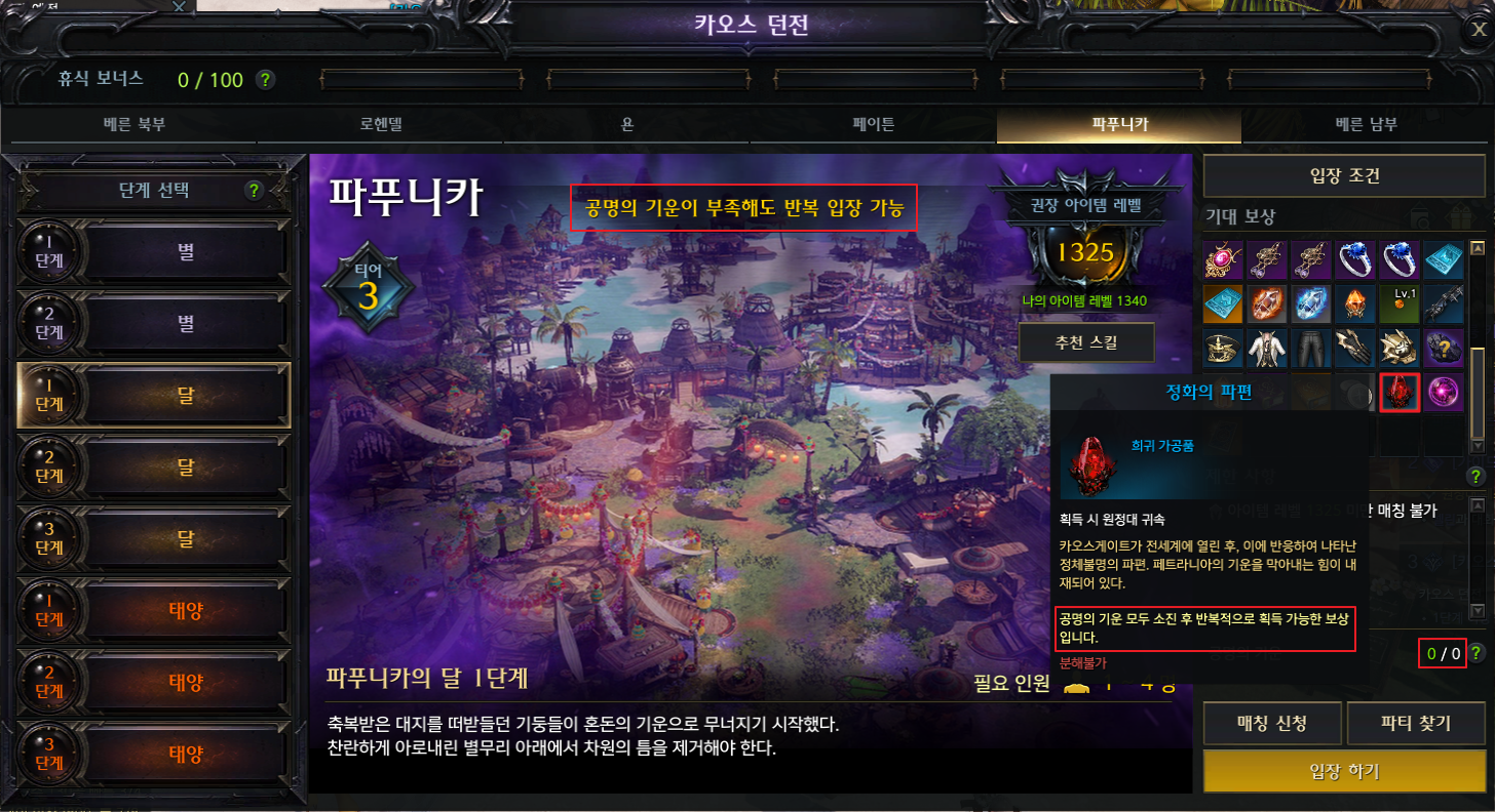 바로 카오스 던전에서 얻을 수 있는 재료입니다. 카오스 던전은 하루에 공명의 기운 100개를 소진해서 2번 갈 수 있는데요. 공명의 기운이 없어도 반복 입장이 가능합니다. 바로 이때 공명의 기운 없이 들어가서 클리어했을 때 획득할 수 있습니다.