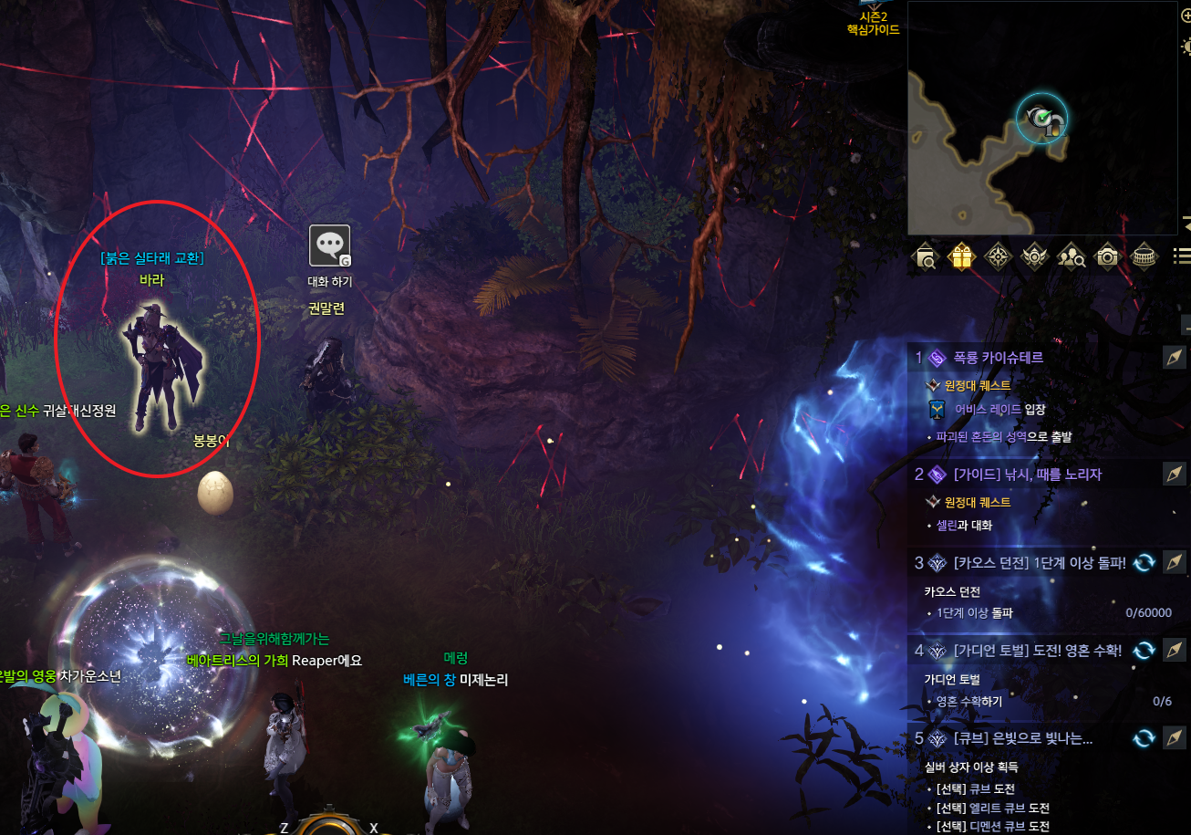 자 이제 던전을 나와서 바로 위에 있는 붉은 실타래 교환 NPC인 바라에게 말을 겁니다.