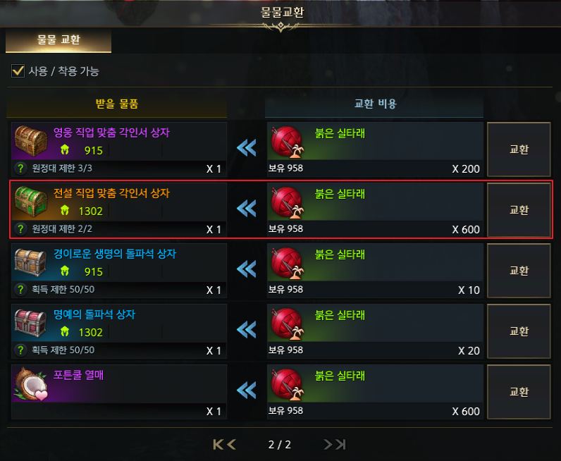 물물교환 2페이지에 전설 직업 맞춤 각인서 상자가 보입니다. 원정대 제한으로 총 2개까지 교환 가능하며 붉은 실타래 600개가 필요합니다. 퀘스트와 탄식의 정원 던전 2번 완료하면 각인서 상자 2개 모두 열 수 있습니다. 참고로 고급, 영웅 직접 맞춤 각인서 상자도 있으므로 일일 퀘스트로 입장권 획득 후 탄식의 정원 던전을 하루에 한 번씩 돌아주세요.