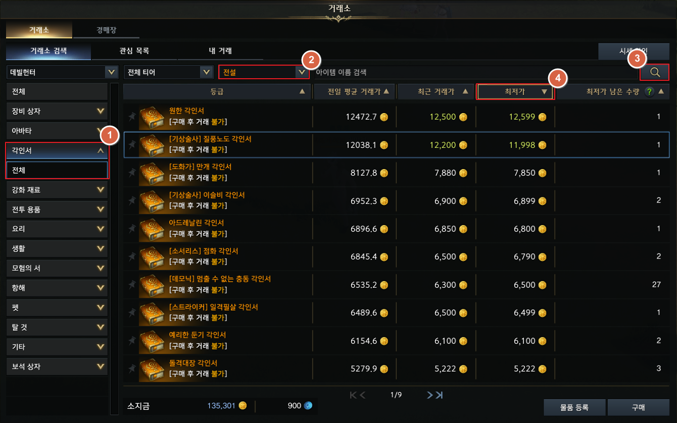 거래소의 왼쪽 탭의 각인서를 클릭하세요. 등급을 전설로 선택하고 검색 버튼을 클릭합니다. 그리고 최저가 버튼을 누르면 비싼 순서대로 확인할 수 있어요. 여기서 각인서는 전투 각인서와 직업 각인서로 나뉘는데 거래소에서 상위권에 있는 각인서는 모두 전투 각인서입니다. 우리는 전설 직업 각인서 상자를 얻었기 때문에 전설 직업 각인서 중에서 가장 비싸게 팔리는 각인서를 팔아야 합니다.