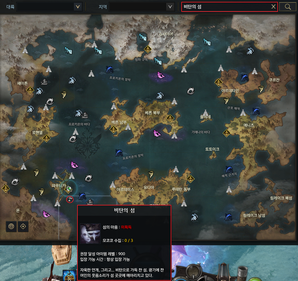 먼저 비탄의 섬을 가야 하는데요. 파푸니카 대륙 우측 아래에 있습니다. 이미 파푸니카 대륙을 진행했다면 얇은 바닷길을 통해 배를 타고 이동하면 됩니다. 참고로 맵에서 섬을 찾기 위해서는 우측 상단 검색창에 섬이름을 검색하면 위치를 확인할 수 있어요.