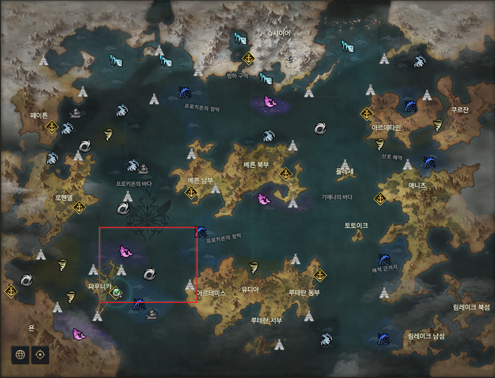 파푸니카 대륙 1시 방향에 보이는 세이렌 해역입니다. 사각형 되어 있는 곳을 클릭하세요.