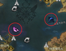 전체 대륙 맵을 보면 왼쪽 분홍색 인어가 세이렌 해역이고 오른쪽 파란색 미역 같은 아이콘이 폭풍우 해역입니다. 둘 다 배로 진입할 때 페널티를 주는 곳입니다. 항해하면서 겪는 패널티를 경험해 보는 가이트 퀘스트인 것 같네요.