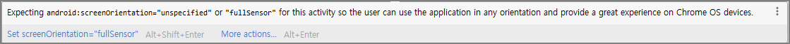 네 제목에도 쓰여있는 것 처럼 unspecified(기본) 나 fullSensor(방향감지)를 사용하라고 권고하고 있네요. 제 앱은 세로 모드인데 말이죠. 실제로 변경하면 경고 밑줄이 없어지긴 합니다. 하지만 위 2가지 모드를 사용하면 가로모드까지 허용되어 버리죠.