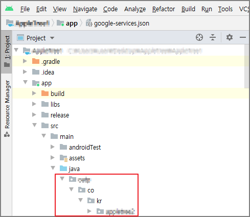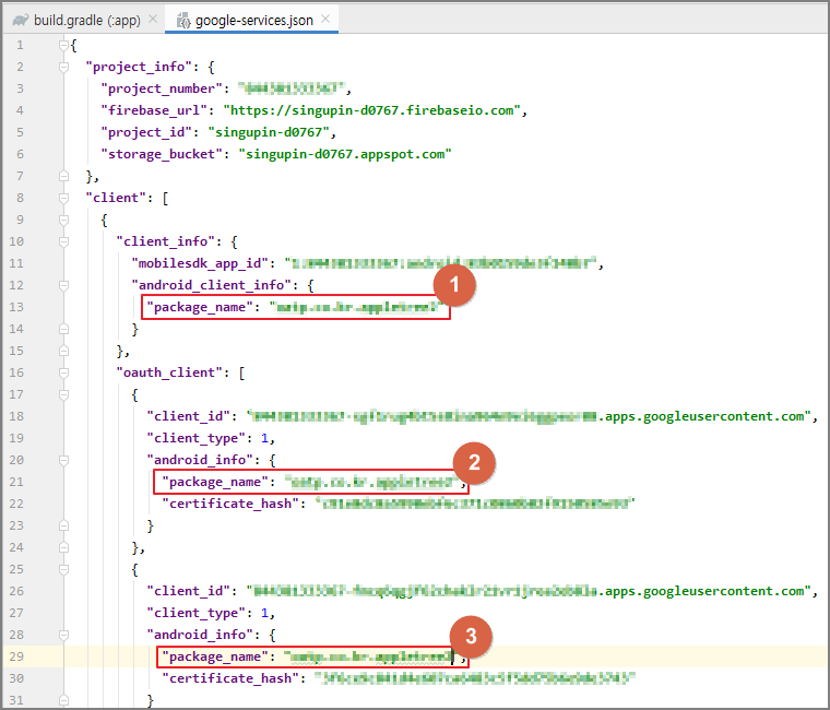만약 google firebase 연동으로 google-services.json 파일을 다운로드 하신 분들은 이 부분도 마찬가지로 수정해 줘야 합니다. package_name 부분은 모두 찾아서 변경해 주세요.