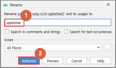 Rename 창에서 패키지명을 변경하고 Refactor 버튼을 클릭합니다.