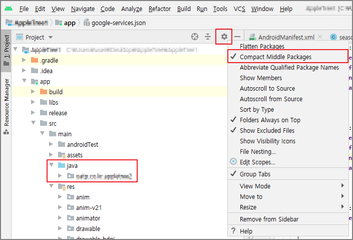 먼저 안드로이드 스튜디오 상단 톱니바퀴 버튼을 클릭하고 Compact Middle Package 가 체크되어 있는 부분을 해제합니다.