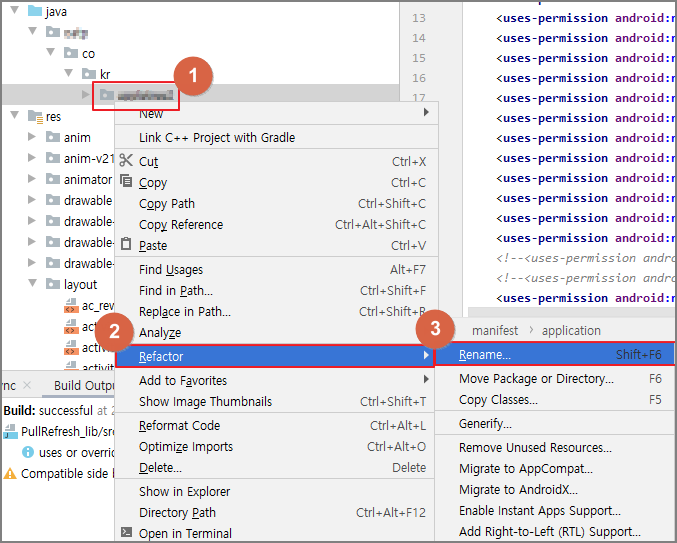 여기서 패키지명을 변경하고 싶은 폴더에서 마우스 우클릭 후 Refactor > Rename을 클릭합니다.