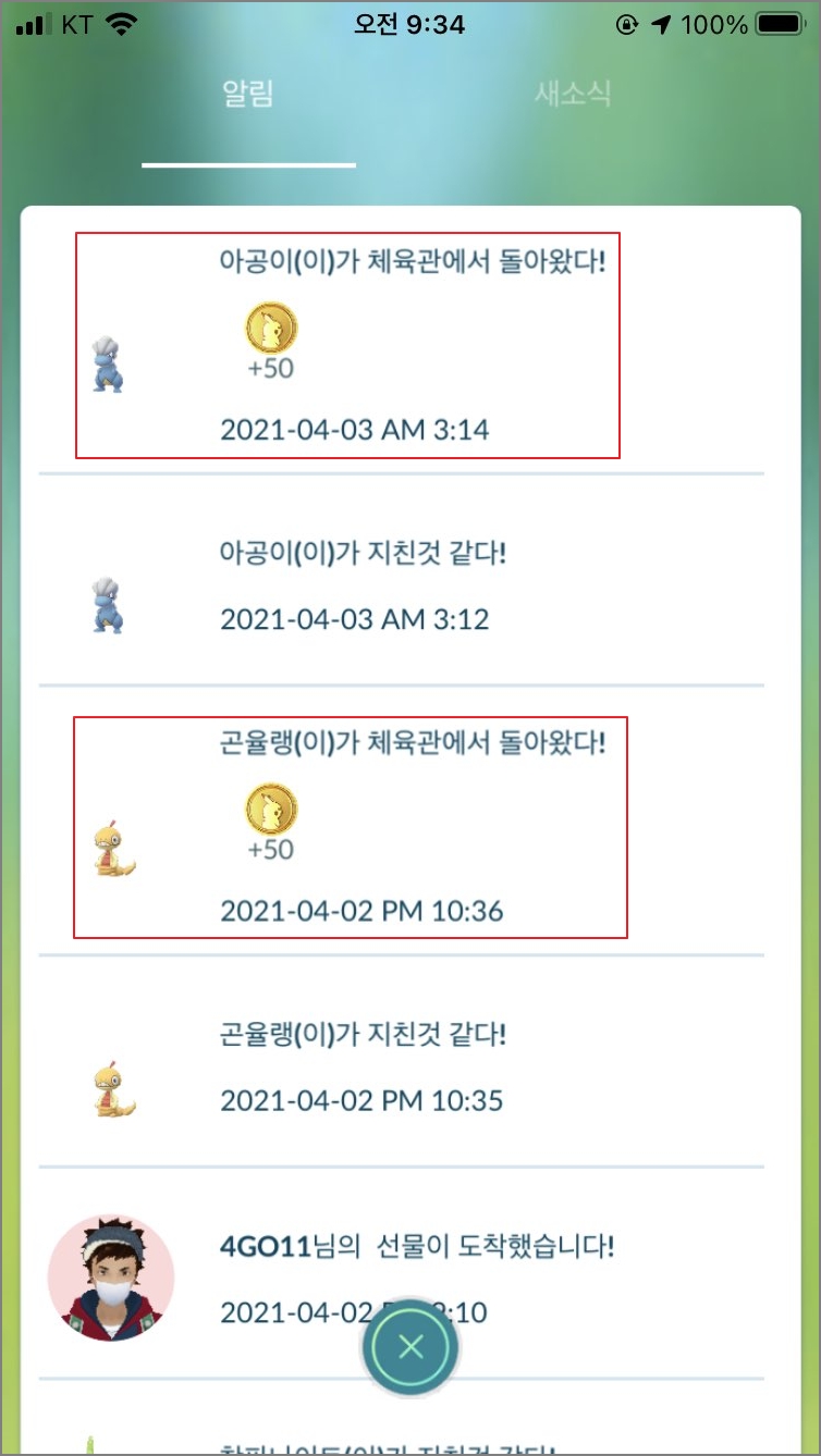 이렇게 체육관을 뺏기게 되면 몬스터가 돌아오고 포켓코인을 얻을 수 있습니다. 아공이와 곤율랭으로 하루에 100 포켓코인 얻었네요.