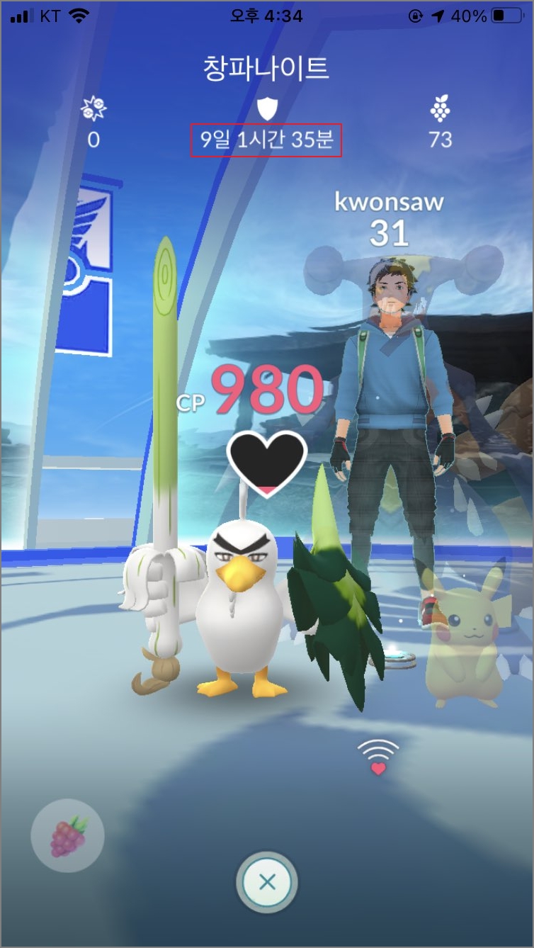 창파나이트가 배치되어 있는 체육관 모습입니다. 방어 시간이 9일이 지났는데 아직 돌아오지 못하고 있어요. 그 이유는 바로 체육관의 위치인데요. 제주도에 있는 우도 전망대 체육관을 점령해서 그렇습니다. 😭 처음에는 좋다고 배치했는데 이렇게 오래 걸릴 줄 몰랐네요.