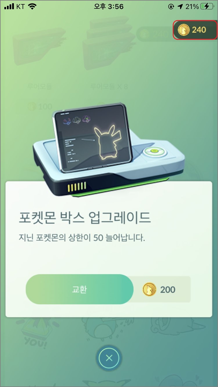 이렇게 체육관으로 얻은 포켓코인으로 포켓몬 박스를 업그레이드했습니다. 200 코인인데 50개 늘어났네요. 그 다음은 가방 업그레이드해야겠어요.