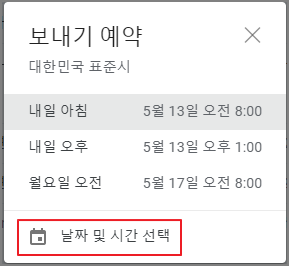 하단에 파란색 보내기 버튼 우측에 펼침 버튼(▽)이 하나 있습니다. 클릭하면 보내기 예약 이라는 버튼이 상단에 나타나게 됩니다.