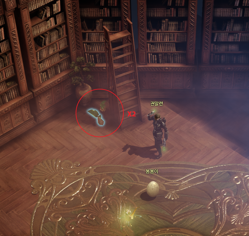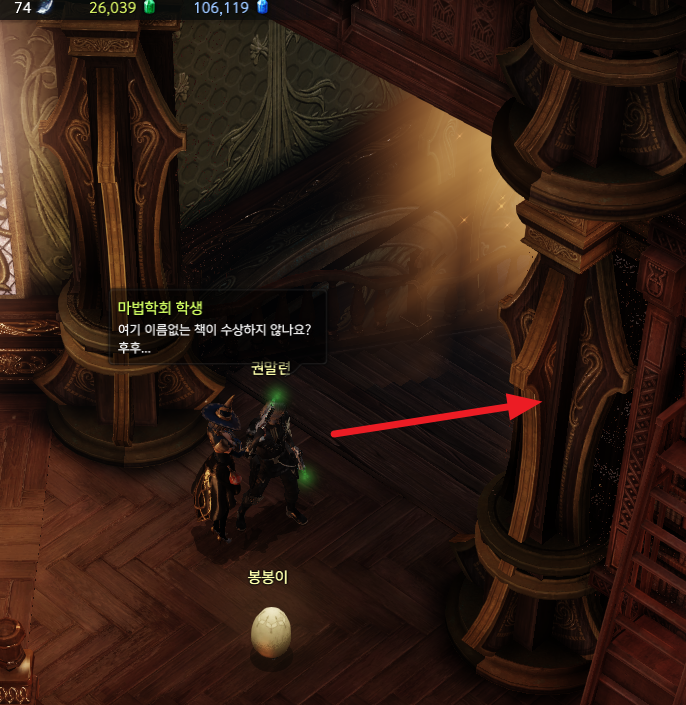 도서관에 들어가서 2층으로 올라갑니다. 미니맵에 보이는 곳으로 이동 후 책장을 보고 있으면 마법학회 학생이 다가오는데 회수 하기(G) 상호작용 버튼이 생깁니다.