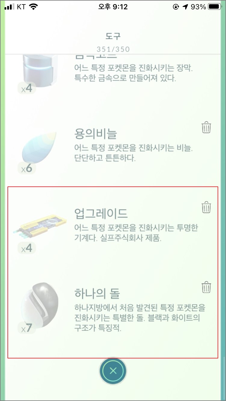 제 가방에 있는 진화 도구들입니다. 태양의돌, 왕의징표석, 금속코트, 용의비늘, 업그레이드, 하나의 돌 이렇게 6가지가 있네요. 여기서 신오의 돌까지 하면 총 7가지 진화 도구가 존재합니다. 이 도구들 중에 하나를 써서 포켓몬을 진화시켜보도록 하겠습니다.