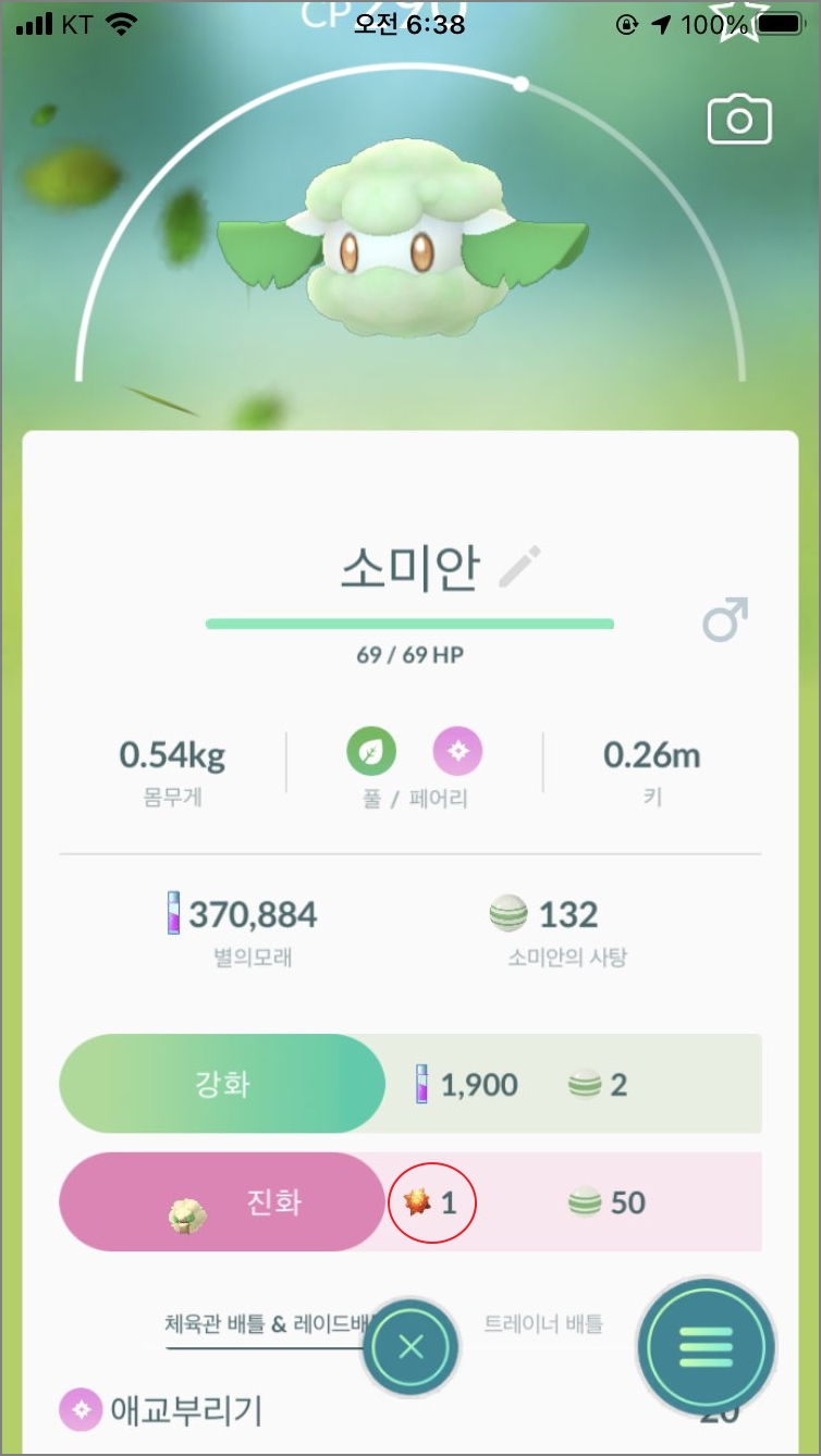 진화할 수 있는 포켓몬을 검색하던 중 소미안을 선택했습니다. 진화 도구인 태양의 돌 1개와 사탕 50개도 모두 만족하고 있군요. 진화 버튼을 누르고 태양의 돌을 클릭하면 진화합니다.