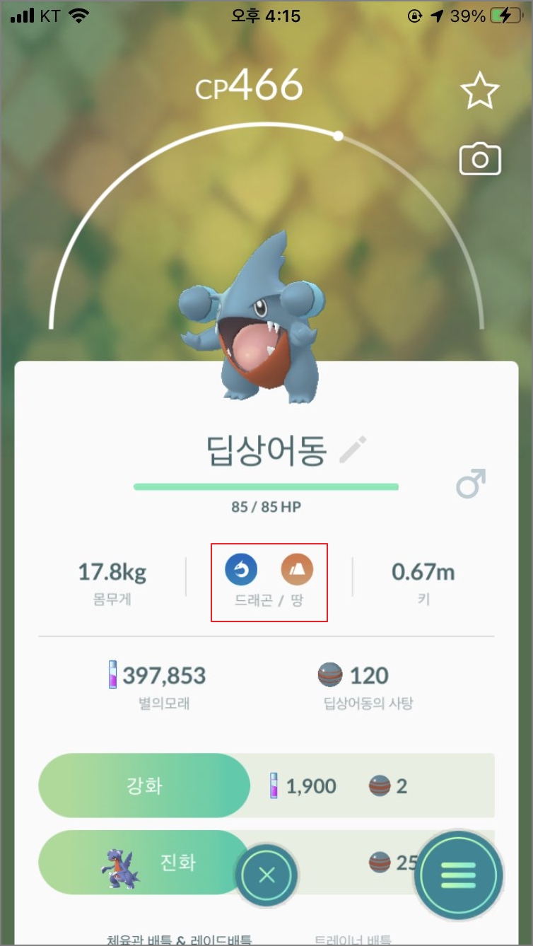 오늘은 커뮤니티 데이를 맞아 딥상어동이 엄청나게 많이 나오고 있는데요. 이때를 이용해서 빠르게 한카리아스로 진화시켜봤습니다. 딥상어동은 한바이트를 거쳐 한카리아스까지 3단계 진화를 하는 포켓몬인데요. 한바이트는 25개, 한카리아스는 100개의 사탕으로 비교적 빨리 진화할 수 있습니다.
