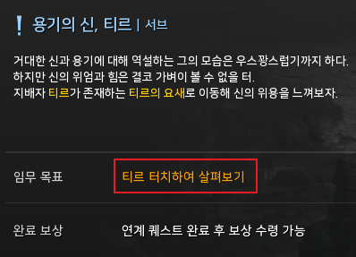 40 레벨 중반에 가면 요툰하임 메인 퀘스트 다 밀고 니다벨리르로 가실 텐데요. 메인 퀘스트와 더불어 서브 퀘스트 또한 마지막이 남아있습니다. 바로 티르 터치하여 살펴보기입니다. 많은 분들이 티르가 없어서 당황하실 텐데요. 리젠 시간이 있기 때문에 항상 있는 보스가 아닙니다.