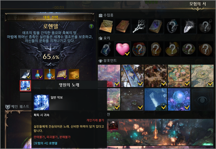 이번 포스팅은 로헨델 지역 모코코를 수집하기 위해 필요한 영원의 노래 배우는 방법에 대해서 알려드립니다. 공명의 노래나 숲의 미뉴에트 같은 경우는 정해진 퀘스트를 수행해야만 얻을 수 있었는데요. 영원의 노래는 로헨델 지역 모험의서 작업을 60% 이상 달성했을 때 얻을 수 있습니다.