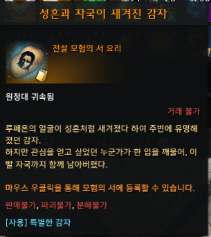 레온하트에 있는 시이라의 호감도를 신뢰로 만들면 특별한 감자를 보상으로 얻을 수 있습니다. 우클릭하면 성흔과 자국이 새겨진 감자를 얻을 수 있어요.