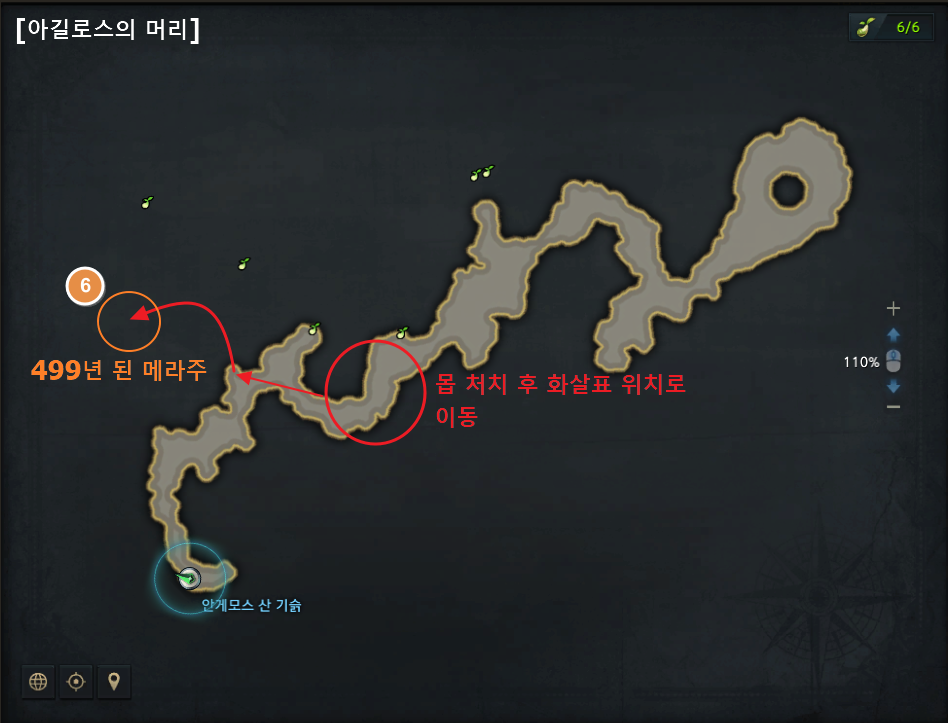 아길로스의 머리 던젼이 변경되었습니다. 빨간색 원 안에 있는 몬스터 처치 후 화살표 시작 방향으로 이동하면 뛰기 버튼이 활성화 되어있습니다. 내려가서 왼쪽으로 가시면 499년 된 메라주를 찾을 수 있습니다.
