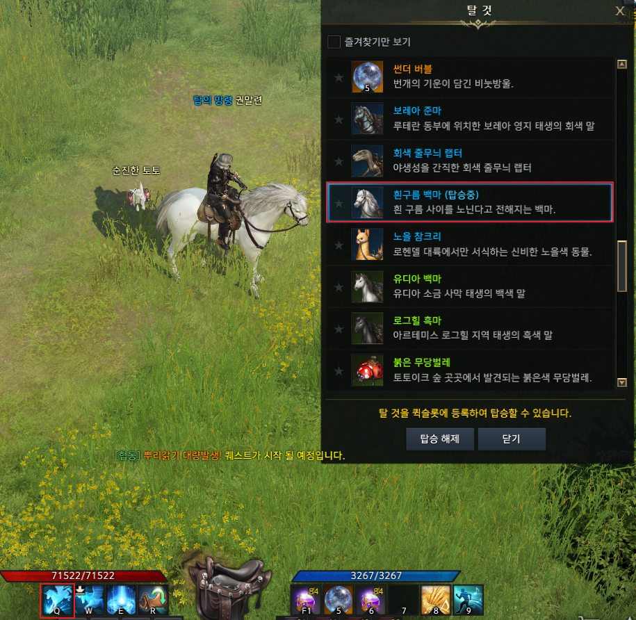 1. 먼저 탈 것 보관함 (Alt+V)에서 흰구름 백마나 바람갈기 야생마를 찾아 탑승합니다.