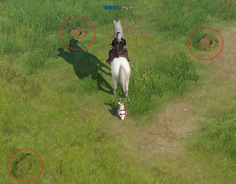 2. 위에 보이는 이미지처럼 뿌리갉기 벌레가 숨어 있는 구덩이에 Q 스킬을 써서 말로 밟아줍니다.