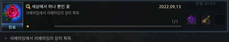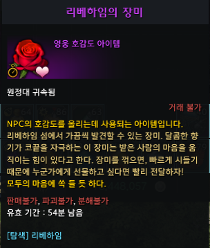리베하임 섬에서 "세상에서 하나 뿐인 꽃" 업적을 달성할 수 있습니다. 업적을 달성하면 "사랑스러운" 칭호와 리베하임의 장미 영웅 호감도 아이템을 얻을 수 있습니다. 호감도 아이템은 유효 기간 1시간 안에 사용해야 합니다.
