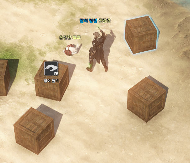 비키니 아일랜드에서 상자를 클릭하면 수행하게 되는 퀘스트 중 어디선가 불쾌한 눈빛 퀘스트를 하게 됩니다. 도중에 톰이 도망가게 되고 여러 개 상자가 보이는데요. 상자를 일일이 다 G키를 눌러서 들지 마시고 찾는 방법이 따로 있습니다.