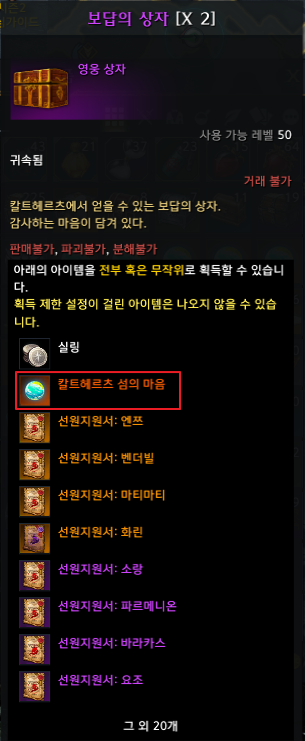 3. 보답의 상자와 풀려난 노예 주머니에서 무작위로 칼트헤르츠 섬의 마음을 얻을 수 있습니다.