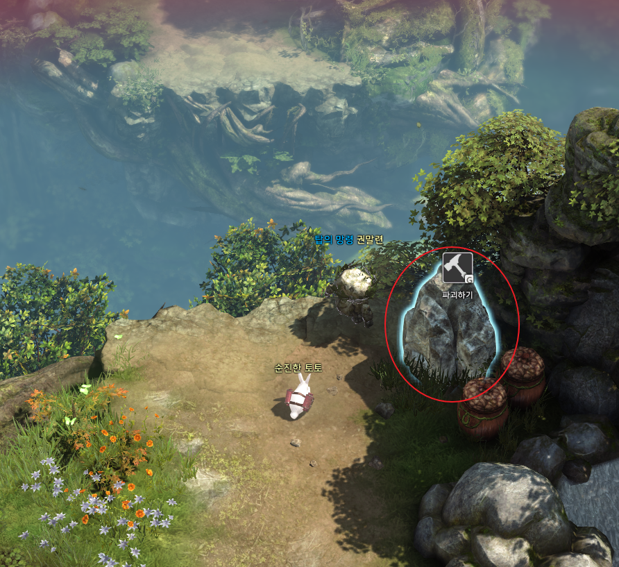 해당 위치로 가면 커다란 바위가 있고 파괴하기 상호작용 버튼이 활성화됩니다. 바위를 깨면 자동으로 건너편으로 넘어갑니다.