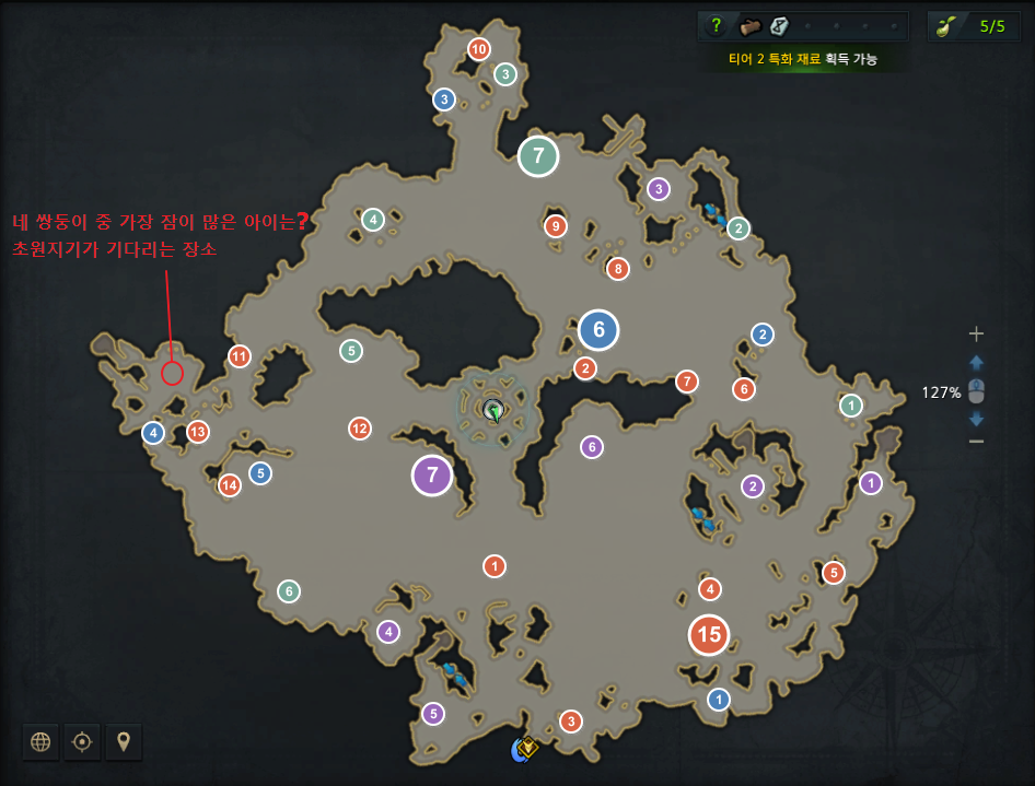 파란색 번호 1~5번까지는 "초원지기의 수수께끼" 퀘스트로 문제를 맞히면 완료됩니다.