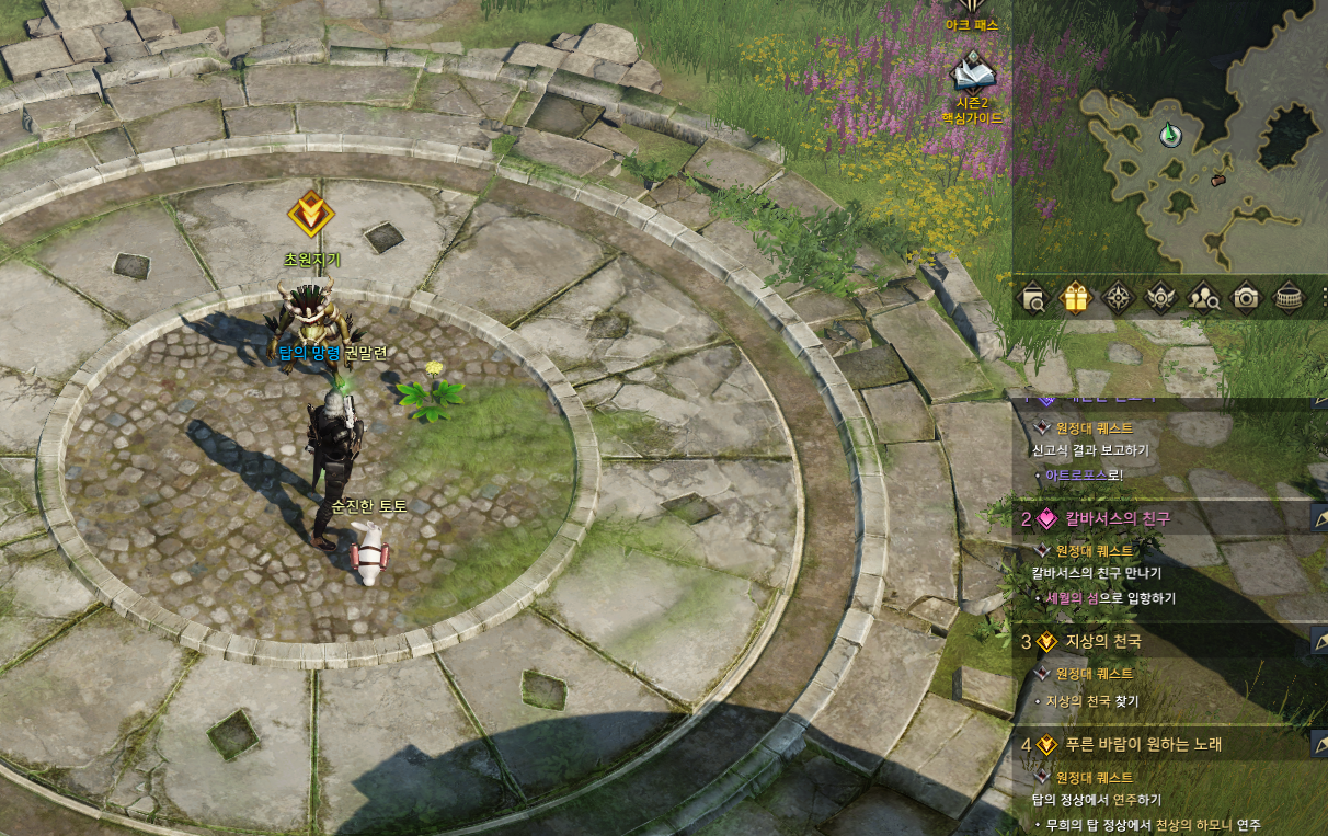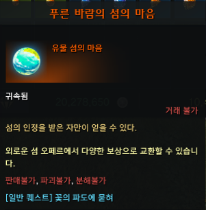 큰 말인형 퀘스트 4개를 모두 완료하면 맵 중앙에 있는 아로네의 꽃의 파도에 묻혀 퀘스트가 뜹니다. 완료하면 섬의 마음을 얻을 수 있습니다. 사랑의 세레나데와 천상의 하모니 같은 악보만 있으면 무난하게 얻을 수 있는 섬입니다.