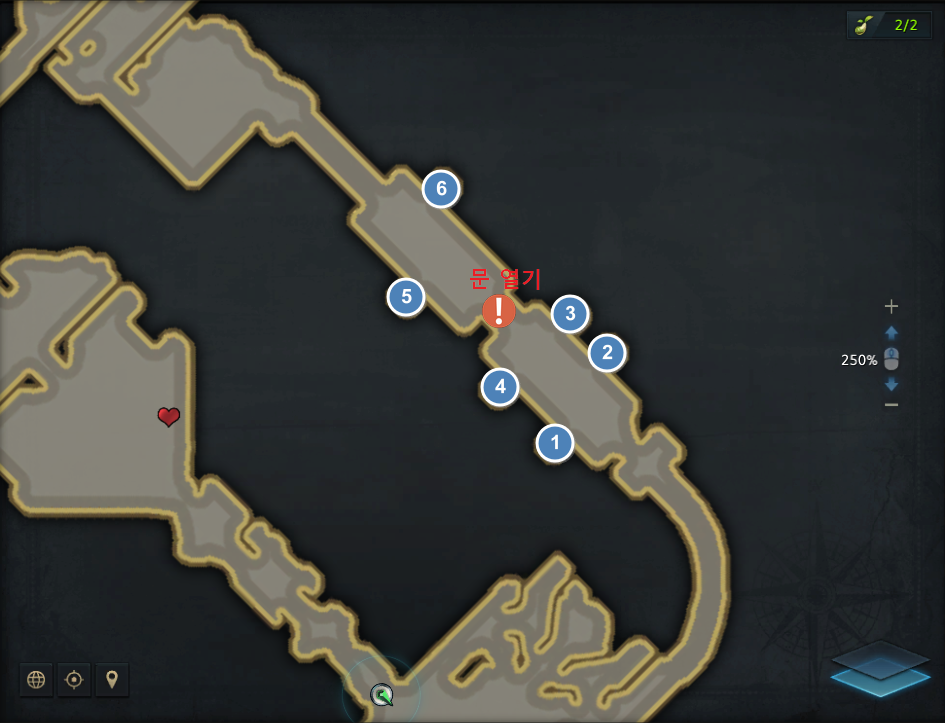1,2,3,4 순서로 문 개방 후 노예 구출하고 느낌표 위치에 문 열고 바로 들어가시면 됩니다. 그다음 5,6번은 천천히 로밍하는 몹 봐가면서 진행해 주세요. 문 열면 즉시 노예 구출하시면 편합니다. 참고로 죽으면 처음부터 다시 시작해서 지겨울 수 있으니 신중하게 원트에 해봅시다.