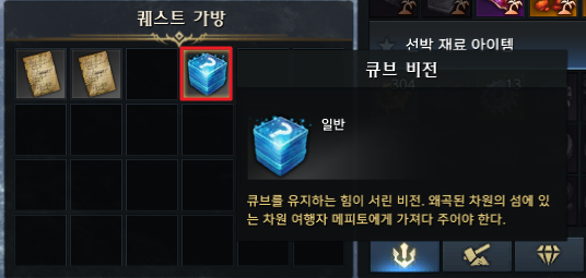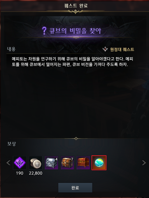 큐브 비전 획득 후 돌아가서 메피토에게 말을 걸면 완료하곱 보상으로 왜곡된 차원의 섬의 마음을 얻을 수 있습니다.