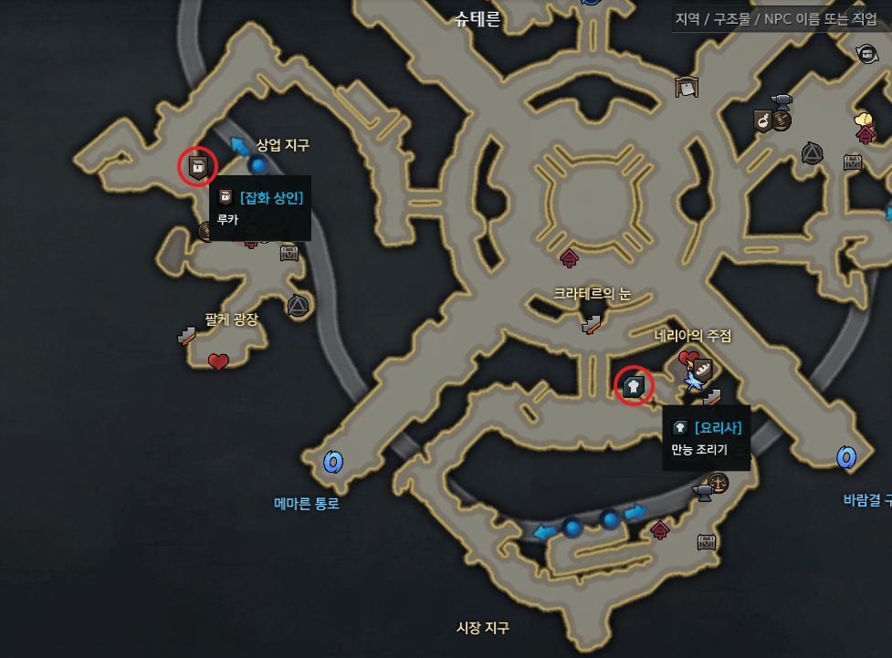 요리 제작에 필요한 요리사 만능 조리기, 잡화 상인 위치입니다. 슈테른 시장 지구와상업 지구 스퀘어홀 근처에 있습니다.