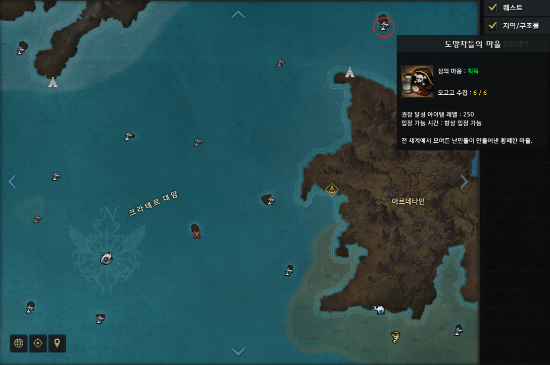 먼저 아르데타인 12시 방향에 있는 도망자들의 마을로 이동합니다. 도망자들의 마을에서 모코코와 섬의 마음만 완료하고 난민 파밀리아 활성화는 하지 않은 것 같네요.