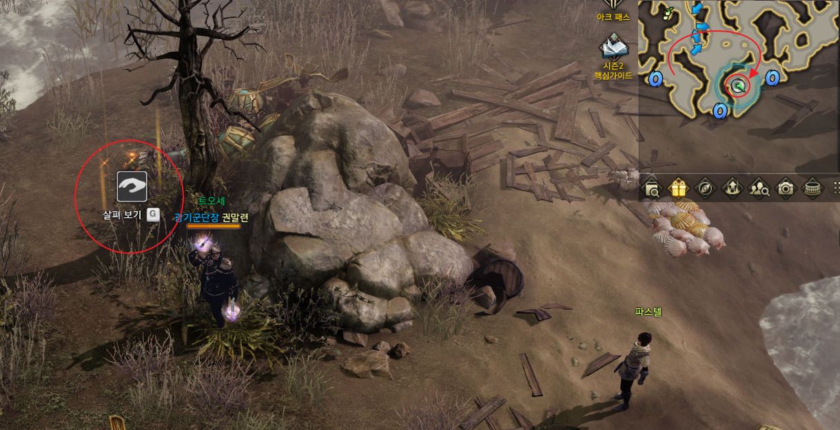 미니맵 위치를 잘 확인해 주세요. 해당 위치로 가서 썩은 나무 왼쪽에 밝게 빛나는 오브젝트를 클릭하면 교육의 중요성 선행 퀘스트인 어디에 쓰는 물건인고? 를 시작할 수 있습니다. 교육의 중요성까지 4개의 퀘스트를 연달아 완료하면 난민 파밀리아의 호감도가 활성화됩니다.