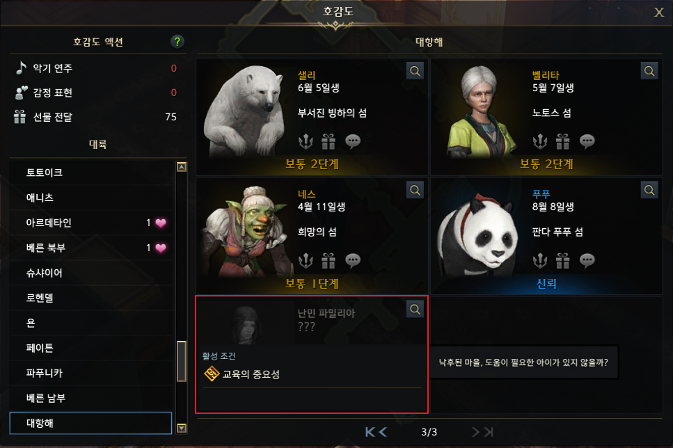 호감도 메뉴에서 대항해 쪽 마지막 페이지를 확인해보니 난민 파밀리아가 활성화되어 있지 않았습니다. 여러분도 한번 확인해보세요. 활성 조건은 교육의 중요성이라는 퀘스트를 완료해야 합니다. 자 그럼 찾아보겠습니다.