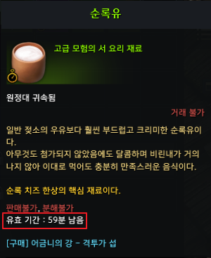 요리 재료 상인에게 순록유를 구매하면 1시간 후 순록유주로 변합니다. 순록유주는 2번 필요한데 1번 사용 후 요리사에게 리필 가능합니다.